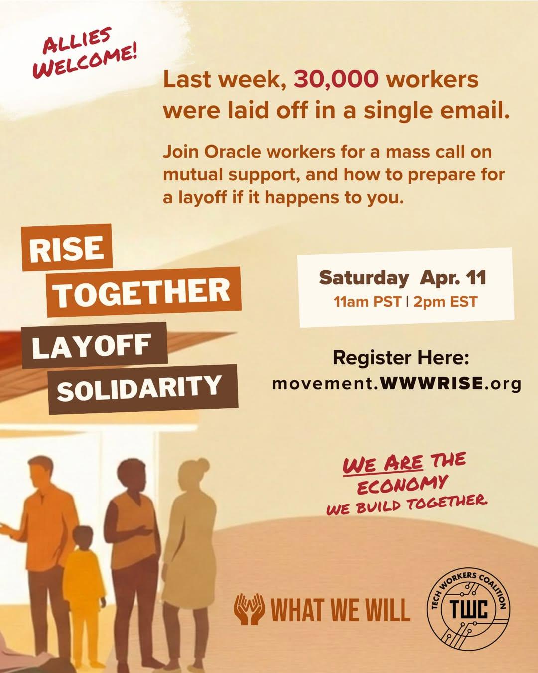 What We Will is hosting a call on Saturday, April 11, 2026 where you can join laid-off workers from Oracle and other companies for mutual support and organizing for change.